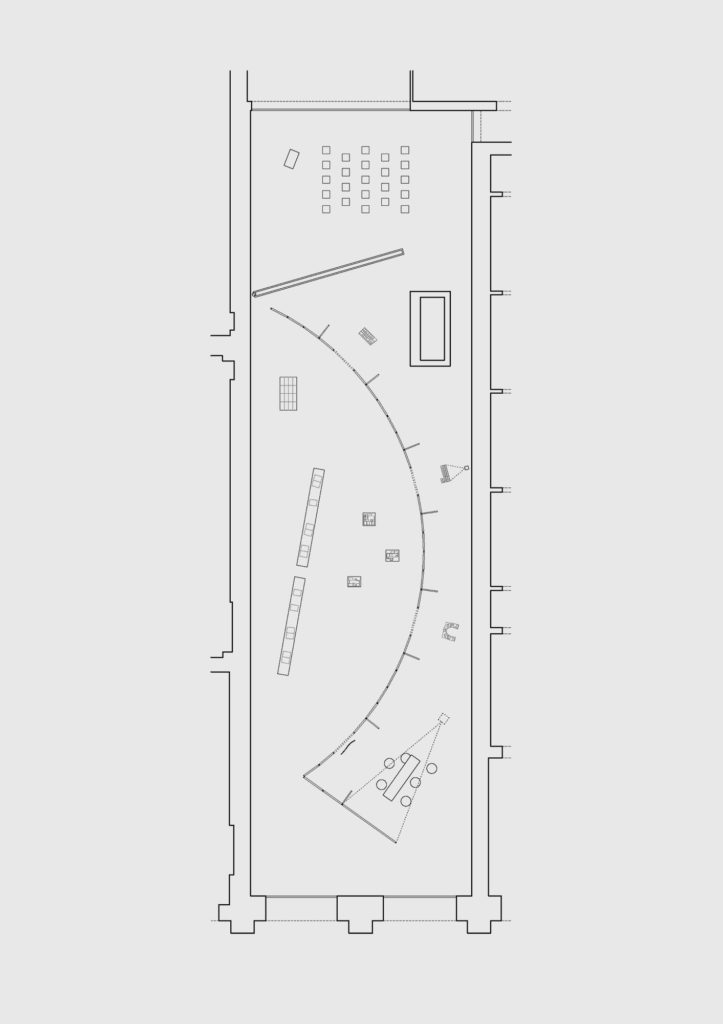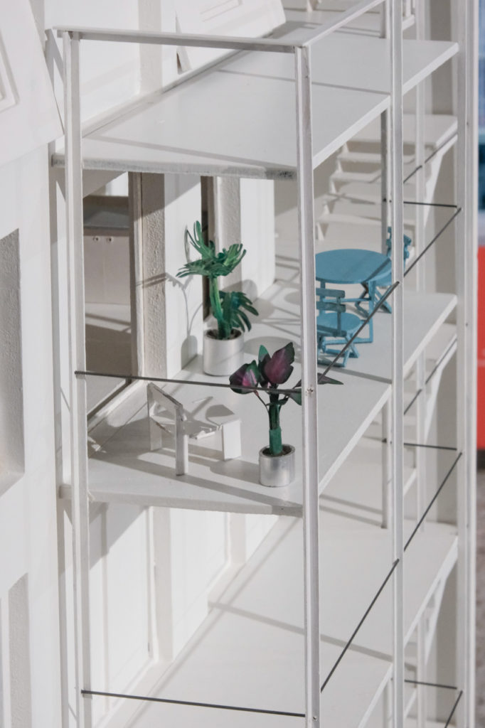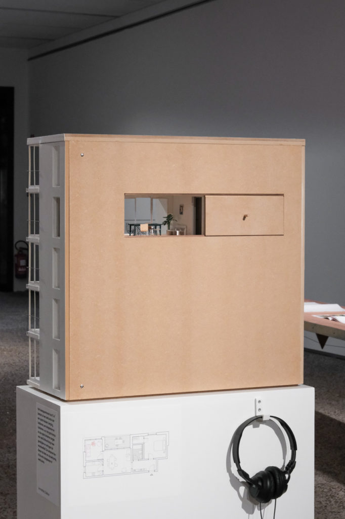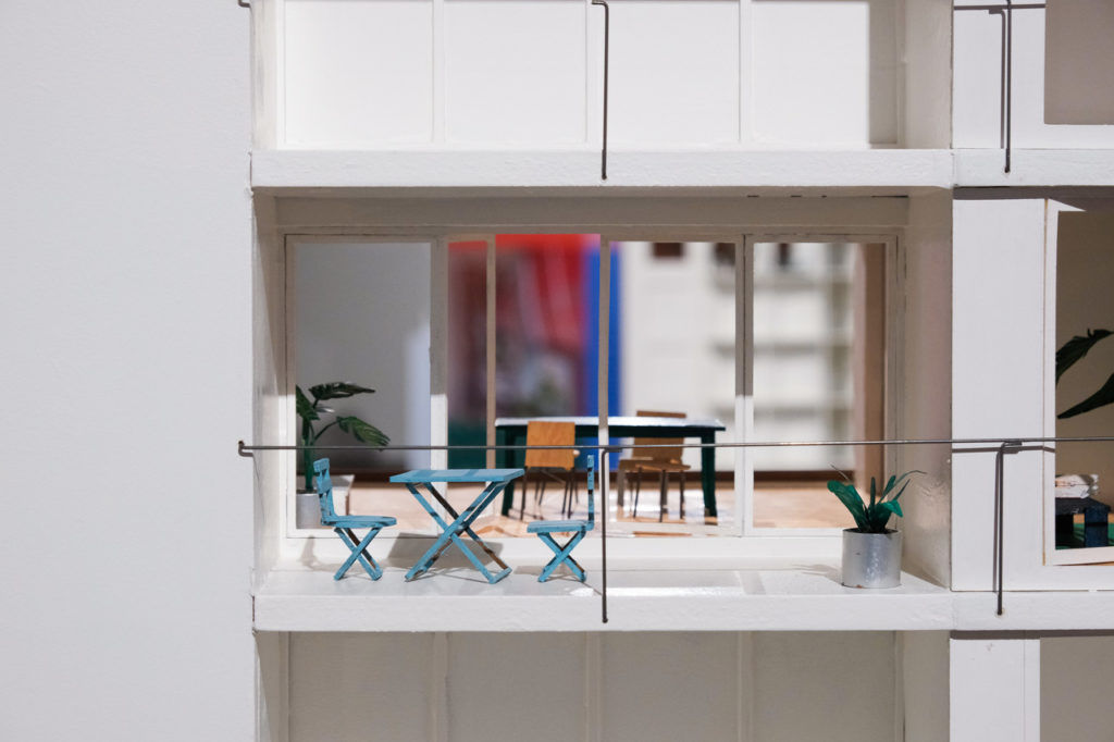 Daarnaast gebruikte Kerremans het grondplan van een coöperatief woonproject van de Zwitserse architect Peter Märkli, meer bepaald het project Im Gut. Märkli staat bekend om zijn zorgvuldige plattegronden, waarin collectiviteit en domesticiteit subtiel samengaan. “Het plan van zo’n appartement vormde de basis voor mijn kruisvormige scenografie. Zo viel de scenografie inhoudelijk mooi samen met het thema van de expo.”